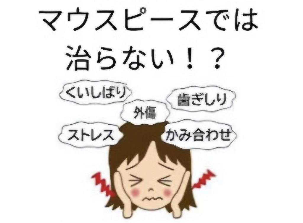 ・マウスピースは歯をプロテクト(守る)する利点はありますが、顎関節症の治療にはならないのです。原因は様々で、もしかしたら「考え事が多い」「悩みが多い」「悔しい思いが強い」など精神的な問題があるかもしれません。また、「重いものを持つ」「スポーツなどで奥歯に負担をかけている」など、肉体的な問題かもしれません。どちらにせよ、顎、口腔に問題があるのか?また、身体全体のバランスの崩れ、歪みから二次的、三次的として顎、口腔に問題があるのか?でアプローチ方法が違ってきます。