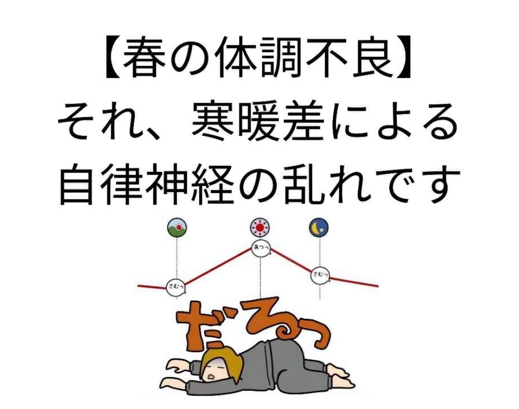 ・3月から4月のこの季節は、昼間はポカポカと暖かいのに、朝晩はひんやりと肌寒いですよね!日によっては20度以上の温度差がある日もあります。私たちの身体は、自動的に体温を一定に保とうと働いています。この調整をしているのは「自律神経」と呼ばれる神経です。でも、気温の変化が極端に大きすぎたりすると、その調整がうまくいかず、交感神経と副交感神経のバランスが崩れてしまうのです。これが「自律神経の乱れ」と言われる状態で、次のような症状を引き起こします。