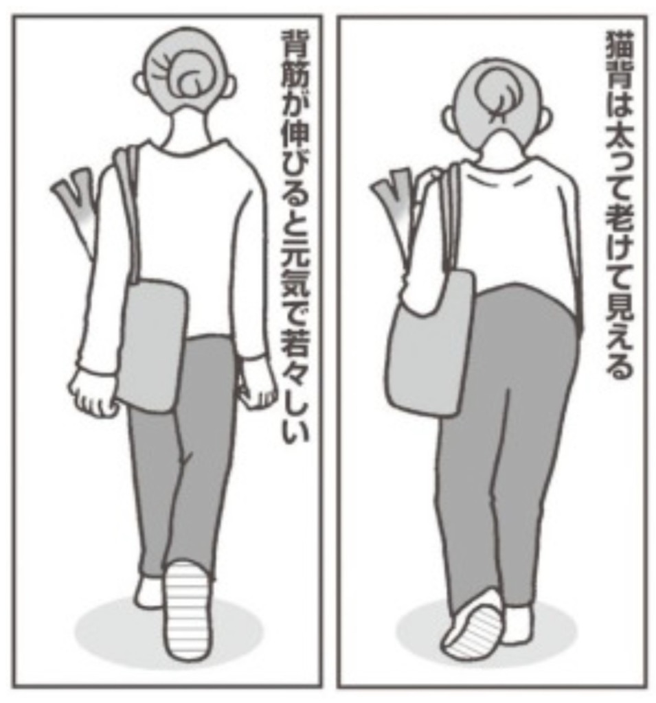 ・悪い姿勢は、顔や身体全体の印象に大きく関係します。例えば、猫背の状態では顎が下がり、二重顎が目立ちやすくなります。また、背中が丸まっていると胸が縮こまり、姿勢が良い人と比べるとエネルギッシュな印象を与えにくくなります。さらに、姿勢が悪いことで身体のラインが崩れ、洋服が似合わなくなるといった問題もあります。実際に良い姿勢で立っているだけで体重が数キロ減って見えることもあるのです。
