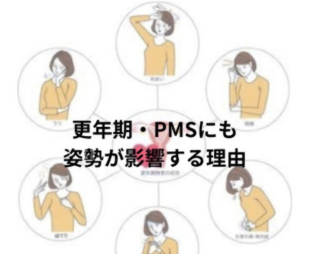等、結果として、更年期症状やPMSが強く出やすくなります。特に猫背、反り腰、首が前に出る姿勢など、これらはホルモンバランスを崩しやすい姿勢です。
