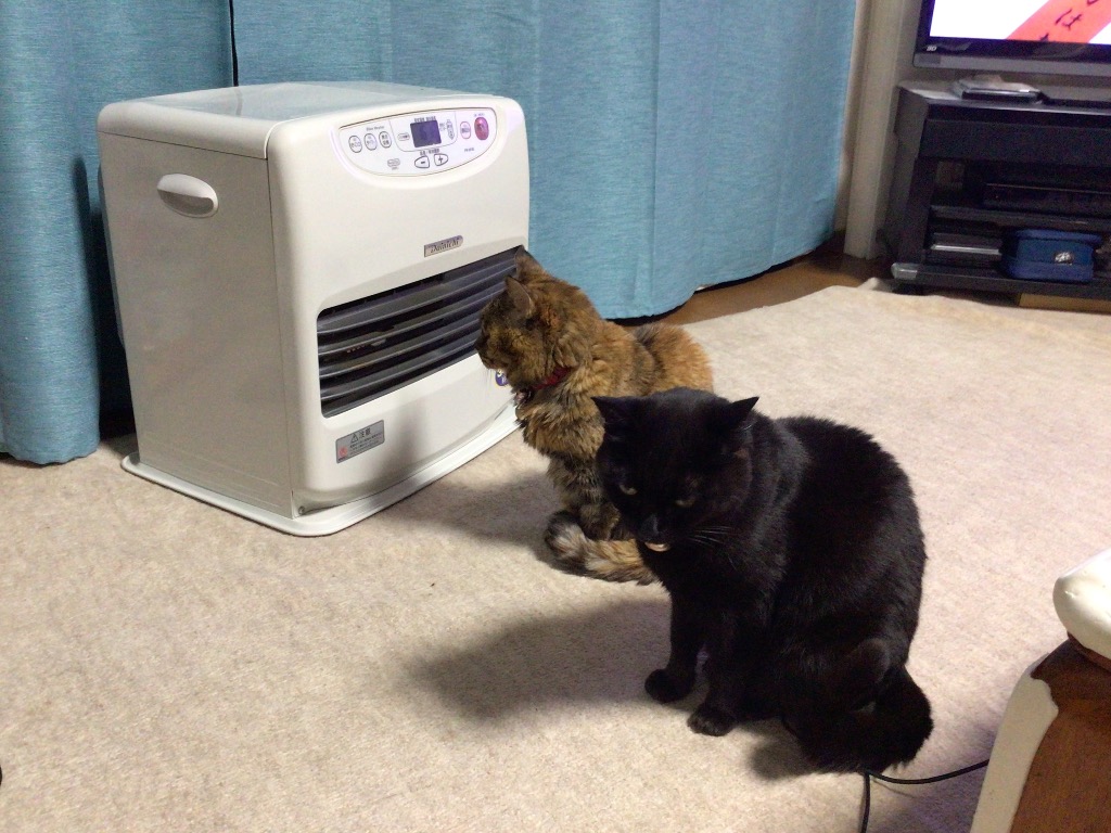 今朝は霧が濃くて外気温が1℃と寒く、部屋のファンヒーターを点けると直ぐに2匹の猫達🐱がファンヒーターの前に陣取りました。体が暖まってくるとその場にゴロリと寝転んでしまう有り様でした。動物の直感でとても寒かったのでしょうね! でもその姿はとても可愛くて頬擦りしてやるとゴロゴロと喉を鳴らしていました。朝から癒されますね♪♪