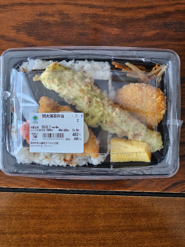 患者様とそんな話をしながら施術を済ませ、お帰りになられるところをお見送りして時計を見ると今日もあっという間にお昼を過ぎてました。さて今日のサラメシはファミマのコンビニ弁当です。(普通ののり弁に明太子が付いただけ)