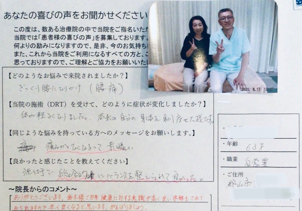 ありがとうございます。○○様ご自身健康に対する意識が高く、よい姿勢もされておられますので早く良くなると思います。頑張りましょう。