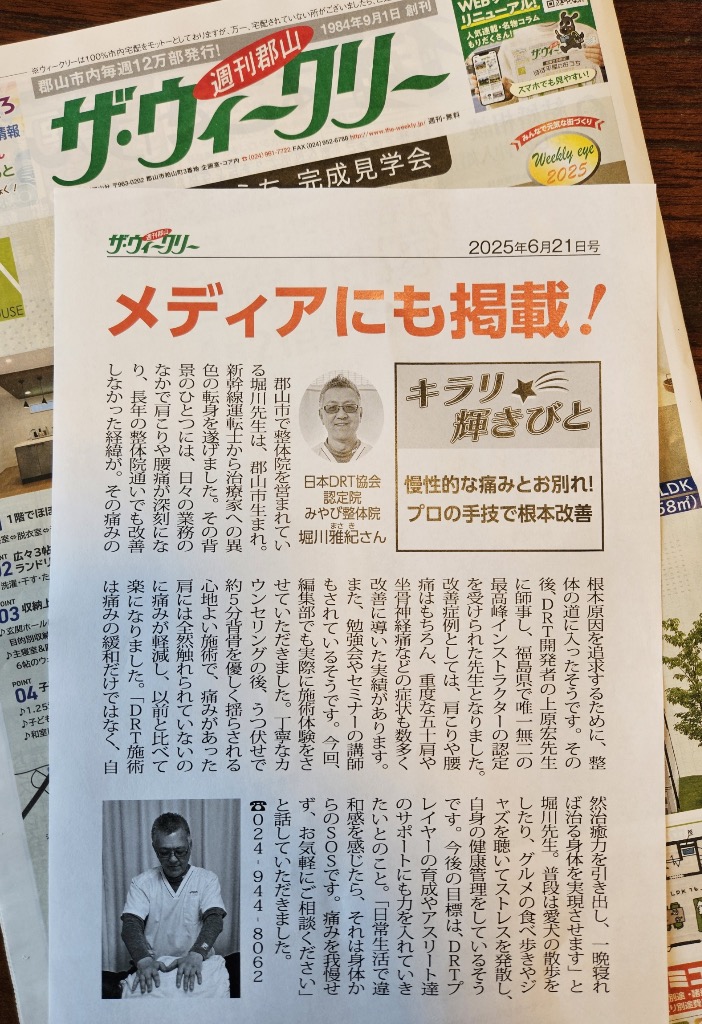 このたび、みやび整体院が6月21日付の週刊郡山ザ・ウィークリーに掲載されました。